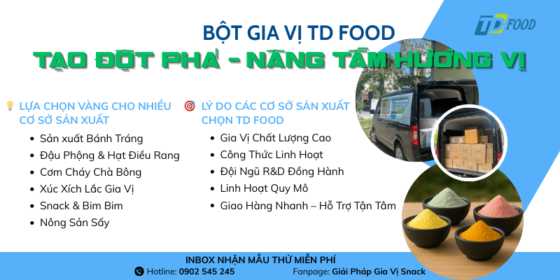 TD Food, với hơn một thập kỷ chắt lọc tinh hoa ẩm thực và nghiên cứu chuyên sâu về công nghệ gia vị snack, chính là đối tác chiến lược đáng tin cậy cho các cơ sở sản xuất đang khao khát nâng tầm sản phẩm, bứt phá doanh thu.