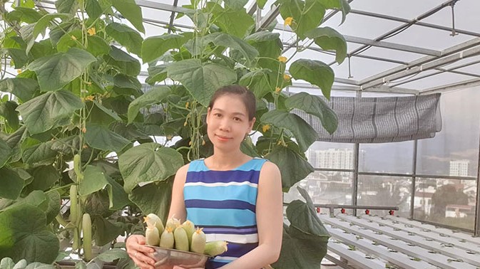 Không chỉ mình anh đam mê trồng rau sạch, anh Bảo còn nhận được sự ủng hộ tuyệt đối từ chính người "bạn đồng hành" của cuộc đời mình. Mỗi lúc anh bận, vợ anh chính là người giúp anh chăm sóc vườn rau thủy canh trên cao này.