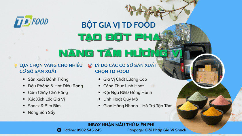 TD Food, với hơn một thập kỷ chắt lọc tinh hoa ẩm thực và nghiên cứu chuyên sâu về công nghệ gia vị snack, chính là đối tác chiến lược đáng tin cậy cho các cơ sở sản xuất đang khao khát nâng tầm sản phẩm, bứt phá doanh thu.